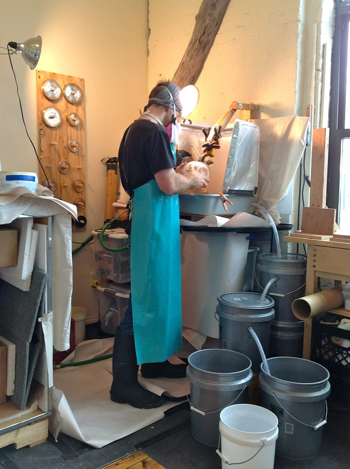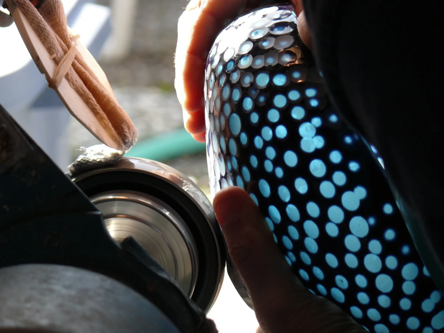 Abrasive wheels are used to grind into the glass and remove the material creating designs and exposing the layers of colored glass beneath the surface. Rougher grits are used first to remove most of the material and then followed up by finer grits to create smoother finishes. Various profile and dimension wheels are used to create different marks in the glass. I primarily use round, flat and V profiled wheels with diamond abrasives for my blown and carved pieces.